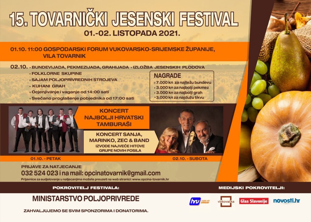 Općina Tovarnik i Odbor za provedbu festivala pozivaju vas na „15. tovarnički jesenski festival“ koji će se ove godine održati 01. i 02. listopada u centru Tovarnika.