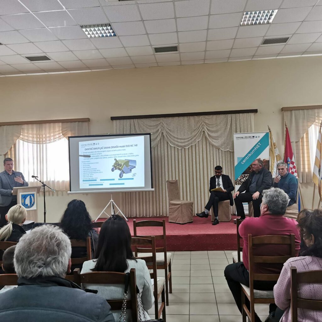 U organizaciji Općine Tovarnik i Ureda za međunarodnu suradnju TINTL, u četvrtak, 21.04.2022. u Vili Tovarnik, održana je radionica o „Organiziranoj proizvodnji slavonskog zelenog graha“. U sklopu radionice, održan je B2B susret (umrežavanje proizvođača zelenog graha) kao aktivnost projekta „centrikomNET – Povećanje konkurentnosti transnacionalnih centara poslovnih kompetencija i mreža“ koji je usmjeren na razvoj i unaprjeđenje inovativnih modela za povećanje konkurentnosti poljoprivrednika. Načelnik Općine Tovarnik, gospodin Anđelko Dobročinac predstavio je mjere za razvoj poljoprivrede za 2022. godinu. Tvrtka Čizmić-zastupanje d.o.o. predstavila je strojeve koji su nabavljeni kroz projekt centrikomNET: stroj za podrezivanje graha te stroj za okretanje-sakupljanje graha. Direktor Eko grude d.o.o., gospodin Željko Miličević imao je prezentaciju na temu: Agrotehnika proizvodnje zelenog graha. Pročelnik Upravnog odjela za poljoprivredu Vukovarsko-srijemske županije, gospodin Andrija Matića, zamjenik direktora Agro-klastera d.o.o., gospodin Željko Cirba i Načelnik Općine Tovarnik, gospodin Anđelko Dobročinac, pridružili su se panel raspravi koju je vodio gospodinu Mladenu Markešiću, direktoru Ureda za međunarodnu suradnju-TINTL. Tema panel rasprave bila je: Što nam nosi umrežavanje u poljoprivredi? Prednosti i nedostaci. Sudionici su razmijenili svoja iskustva o mogućnostima povezivanja na domaćem i stranom tržištu. Po završetku radionice podijeljene su potvrde polaznicima edukacija: „Prerada povrća“ i „Zaštita biljaka“ održanim u sklopu projekta centrikomNET.