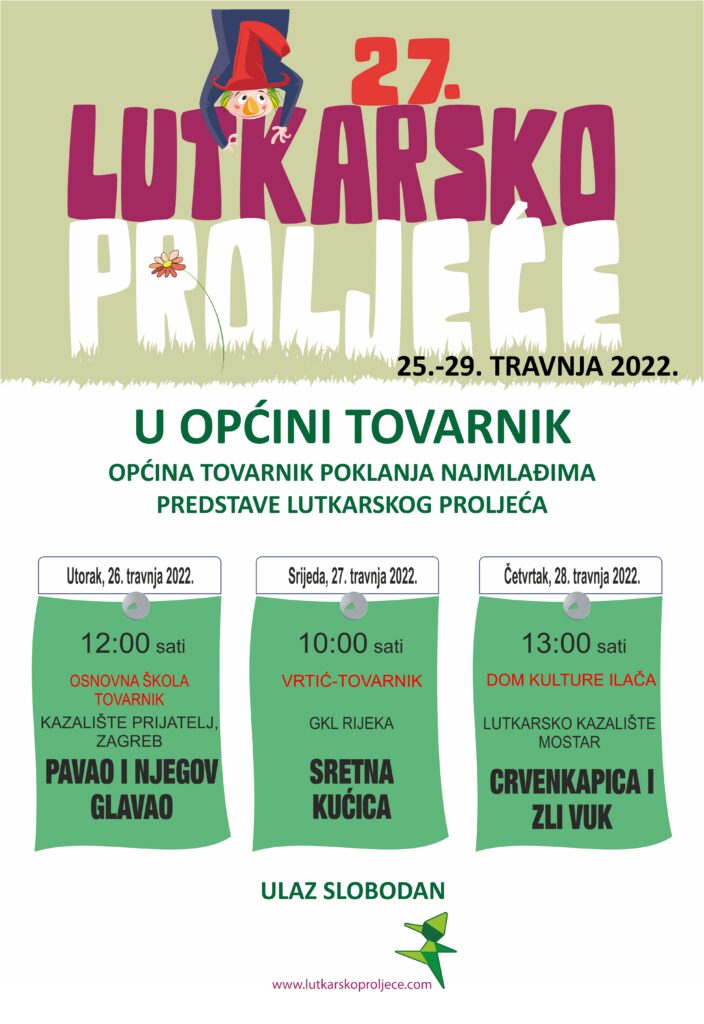 Općina Tovarnik i ove godine daruje svojim najmlađim stanovnicima tri lutkarske predstave u sklopu 27. Lutkarskog proljeća koje traje od 25. do 29. travnja 2022. god. Predstave će se održavati u osnovnim školama i dječjem vrtiću. Iako su predstave za djecu, svi su dobrodošli.