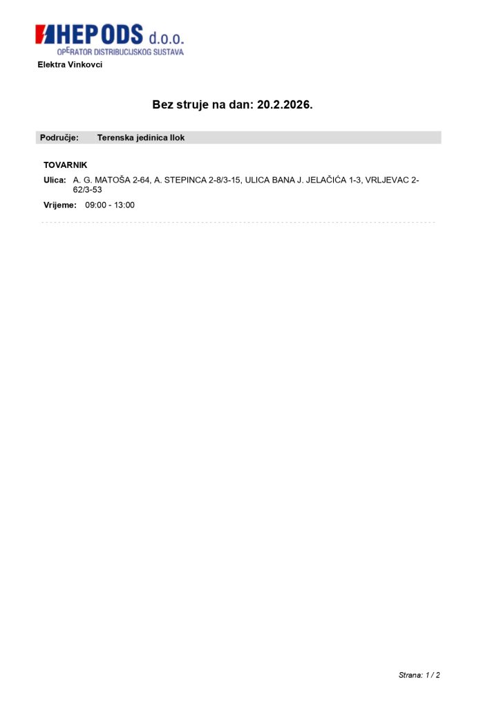 Prekid u opskrbi električnom energijom predviđen je dana 20.02.2026. godine, u vremenu od 09:00 do 13:00 sati.