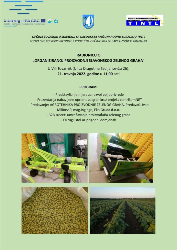 Općina Tovarnik u suradnji s Uredom za međunarodnu suradnju TINTL poziva sve poljoprivrednike s područja općine koji se bave uzgojem graha na radionicu koja će se održati u Vili Tovarnik 21.travnja 2022. godine s početkom u 11:00 sati.