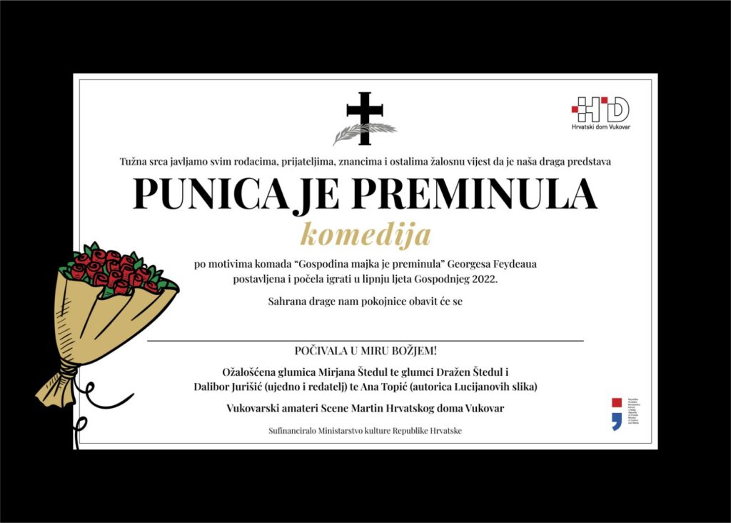 Povodom Dana Općine Tovarnik 2022., vukovarski amateri Scene Martin Hrvatskog doma Vukovar, odigrat će predstavu PUNICA JE PREMINULA, 9.6.2022. ( četvrtak ) u Vili Tovarnik u 18h. Svi su dobrodošli.